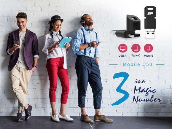 全球記憶儲存領導品牌SP廣穎電通推出全新三用OTG隨身碟-Mobile C50。此款隨身碟完整搭載三重傳輸介面- USB Type-A、Micro-B、Type-C,為目前市面上少見可輕鬆滿足所有資料傳輸需求的OTG隨身碟。擁三傳輸介面,可適用於各種行動裝置,是跨裝置傳輸的最佳橋梁,使便利性與靈活性倍增;且Mobile C50提供最高達128GB的儲存空間,可立即擴充新型裝置容量,也可大量儲存喜愛的媒體檔案及重要資料。