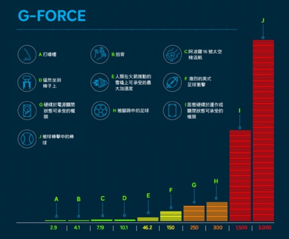 衡量力的其中一種單位就是 G 力(G-Force, Gs),這是一種加速度,因物體抵抗加速而產生的一股與加速度方向相反的力,當一個物件掉落、撞擊或碰撞時,Gs 就會瞬間飆升。讓我們更具體的比喻,當你的叔叔拍你的背時,你所承受的衝擊力大約是 4.1Gs;踢一顆足球則會產生大約 300Gs 的衝擊力。一個完全停止運作、無電源的傳統硬碟,能承受 2 毫秒約 250Gs 的衝擊力,當硬碟正在寫入資料時,僅能承受 30Gs 的衝擊力;讀取資料時則是能承受 60Gs 的衝擊力。所以在硬碟運作的同時,要避免移動機體。若真的需要移動時,建議先將系統關機,確定硬碟停止運作後再動作。