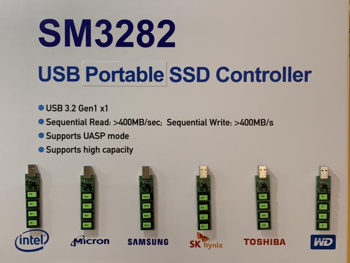 目前巿場上可攜式SSD 均採用橋接晶片設計,將原SATA 或 PCIe 介面轉接為USB 介面。 SM3282 為單晶片USB 3.2 Gen 1 介面設計,提供完整的單晶片硬體及軟體解決方案,並支援UASP 協定。SM3282採用雙通道設計,並支援最新一代 96 層 QLC NAND,其容量最高可達2TB,並採用低功耗設計,毋須外部電源IC即可自行運作,降低物料(BOM)成本。