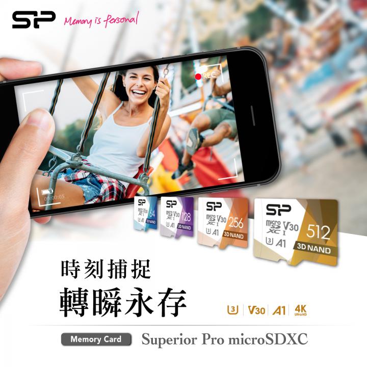 SP廣穎電通發表Superior Pro microSDXC記憶卡,搭載UHS-I U3高速規格,符合V30錄影速度等級效能,支援高速連拍、不間斷攝影,以及高畫質4K Ultra HD影片的攝錄與播放,讀寫速度分別高達每秒100MB及80MB,傳輸檔案更加省時迅速,使智慧型手機與平板電腦拍出的影像與專業相機相較毫不遜色,時下正夯的空拍機、運動攝影機亦相容適用。