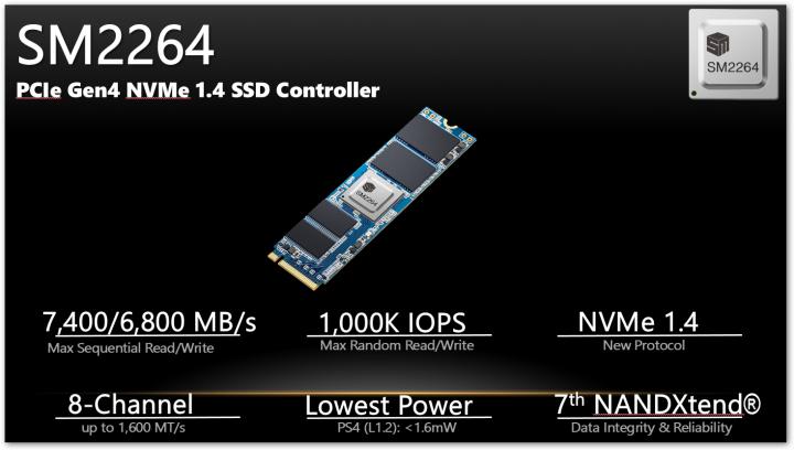 SM2264主要瞄準高效能和車用級 SSD 應用,搭載四核心ARMR CortexR-R8 CPU,內含四個 16Gb/s PCIe 資料匯流排,並支援八個 NAND 通道,每個通道最高可達每秒 1,600 MT。SM2264的先進架構採用12奈米製程,能夠大幅提升資料傳輸速率、降低功耗並提供更嚴密的資料保護,連續讀寫效能最高可達 7,400MBs / 6,800 MBs,隨機讀寫速度最高達 1,000K IOPS,提供使用者前所未有的超高效能體驗。ARMR CortexR-R8架構提供高速多執行緒處理能力,可滿足新一代儲存應用所需的混合工作負載作業需求。SM2264 搭載慧榮科技最新第 7 代 NANDXtendR技術,結合慧榮科技專利的最新高效能4KB LDPC糾錯碼(ECC)引擎和RAID功能,為最新一代的 3D TLC 和 QLC NAND 提供極佳的錯誤校正能力。內建 SR-IOV 功能的 SM2264 也是車用級儲存裝置的理想選擇,最多可同時為八台虛擬機器(VM)提供直接的高速 PCIe 介面。SM2264 目前進入客戶送樣階段。