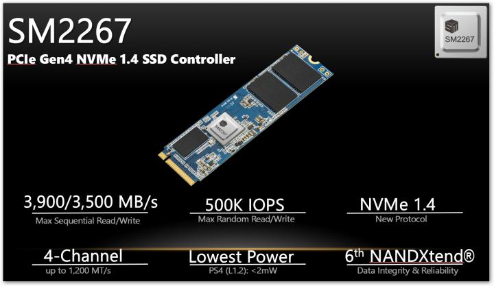 針對主流和入門級 PCIe Gen 4的解決方案:SM2267 支援Gen4 x 4 通道、4 個 NAND 通道設計; SM2267XT支援Gen4 x 4 通道、4 個 NAND 通道、DRAM-less