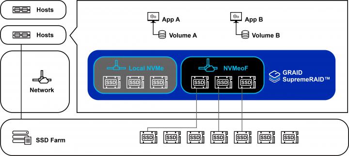 採用彈性更高的「組合式基礎架構」,透過 NVMeoF 連結遠端 SSD,並整合本地端 SSD 組成具資料保護的儲存池,直接配置給指定的應用軟體,同時在效能方面可提供高達 600 萬 IOPS 4K 的隨機存取,以及 100 GB/s 的循序存取能力,突破傳統限制,效能遠優於市面最高階硬體的 RAID 卡。