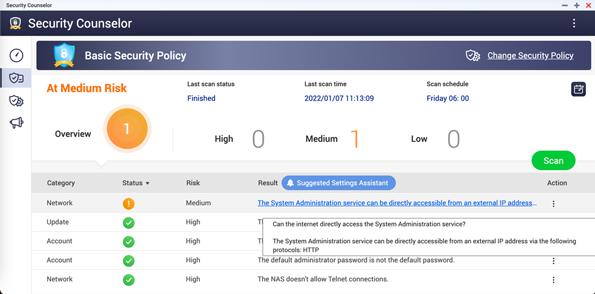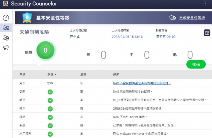 開啟 QNAP NAS 的 Security Counselor 程式,如發現 “The System Administration service can be directly accessible from an external IP address via the following protocols: HTTP” 的警示文字,代表您的 NAS 正暴露於外網,風險極高。