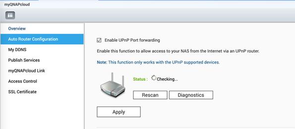 開啟 QTS 的 myQNAPcloud 應用程式,檢查 UPnP Router 設定。取消勾選 “Enable UPnP Port forwarding”