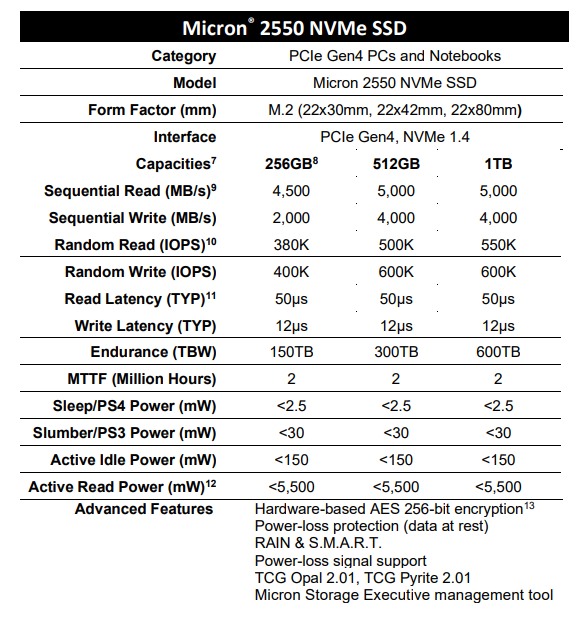 [1]美光內部 PCMarkR 10 測試指標顯示,美光 2550 SSD 領先競爭對手的 SSD。拿來與美光 2550 SSD 比較的競爭對手 SSD,為出自 2022 年 11 月 22 日 Forward Insights 第三季 SSD 供應商現況報告所指出的客戶端 SSD 營收市佔率前五大領導品牌。.