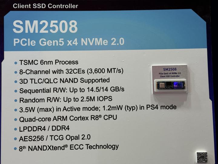 - SM8366:14 GB/s 循序讀與 3.5M IOPS 隨機讀 SSD 效能,支援容量超過 128 TB,16 通道設計,可提供高達 2400MT/s 的 TLC 與 QLC NAND 傳輸速度。