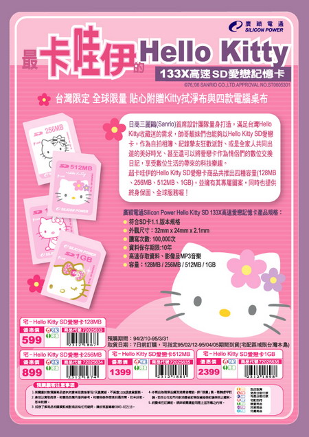 超卡哇伊的Hello Kitty SD愛戀記憶卡是由熱銷全球90餘國的廣穎電通 (Silicon Power),暨推出席捲台灣蝙蝠俠迷收藏慾望的全球限量記憶卡後,特別委託日商三麗鷗(Sanrio)首席設計團隊,雙方攜手合作所推出的台灣區限量商品。除了滿足台灣Hello Kitty收藏迷的需求外,帥哥靚妹們也能夠以Hello Kitty SD愛戀卡,作為數位的自拍相簿。不但可以紀錄摯友狂歡派對、或是全家人共同出遊的美好時光、甚至還可以將愛戀卡作為情侶們的數位交換日記,享受數位生活的帶來的科技樂趣!