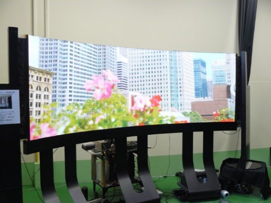 日本篠田(Shinoda)公司日前展出一款 125吋的曲面電漿螢幕,但令人訝異的是重量只有 3.6kg,厚度更只有 1mm。此款螢幕寬達三公尺、高度也有一公尺,是由三個 1x1m的螢幕模組構成。而畫素則為 960x360(有點給他低!),消耗功率則為 600W。