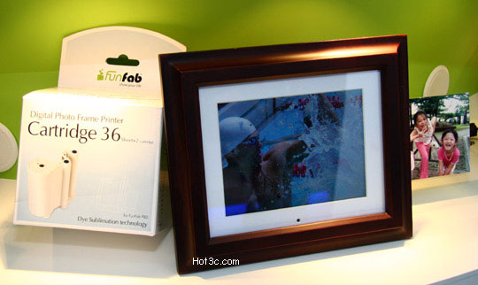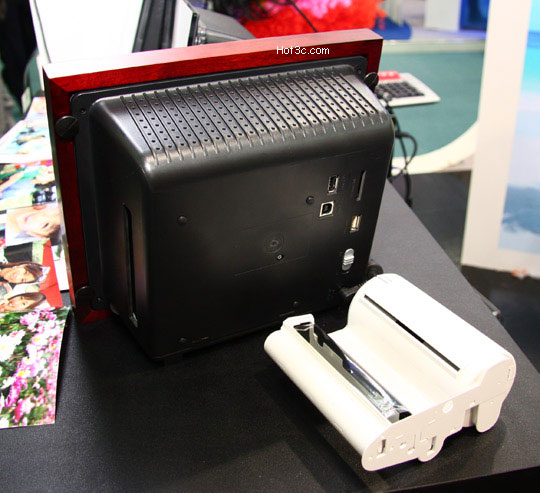 Computex 2008 上無奇不有。我們剛看到這個攤位時,剛開始以為又只是數位相框,好像沒什麼特別的(Computex 上展出數位相框的廠商沒有百家也有 50家)。不過筆者剛好反射動作會往產品前後瞧瞧,發現這款相框被背面竟然特別 "肥大",一問之下,原來是內建了相片印表機,就是那種熱昇華打印方式的印相機。
