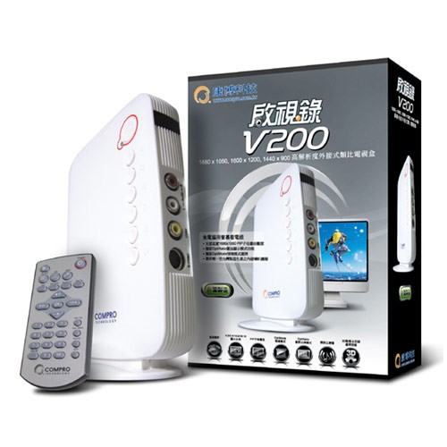 只要有螢幕,就可以迅速升級成多媒體娛樂中心;無需花費多張小朋友、更不需佔用空間,影音娛樂可立即享受。 康博科技的啟視錄V200外接式電視盒,適用於各式電腦螢幕、LCD /CRT顯示器、大尺寸液晶、電漿顯示器或是投影機,不但可收看精彩第四台電視節目、VCD、DVD,更可打Xbox、 Xbox360、PS2、PS3及Wii 等電玩。支援1600x1200, 1680x1050, 1440x900的高解析度觀賞,更加入超強化3D 動態去交錯處理技術、雜訊抑制、循序式掃描與3:2下拉式影像還原技術,提供一般市售電視盒無法比擬的清晰亮麗畫質觀賞。