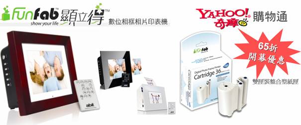 「環茂數位生活館」開幕大回饋,即日起至耶誕節前(12月25日),到Yahoo!奇摩購物通購買全球首創的abit FunFab顯立得 數位相框印表機,商品不但免運費、立即享有優惠價格,再另外追加abit FunFab顯立得雙匣裝整合型紙匣(可列印72張相片) 65折加價購優惠。