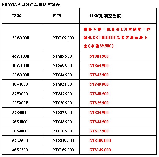 為了回饋消費者的支持,台灣新力國際股份有限公司將於即日起調整部份BRAIVA液晶電視產品價格,讓消費者輕鬆擁有高品質的影音享受。其中 52吋機種降價達兩萬元,降幅達 14% 左右。
