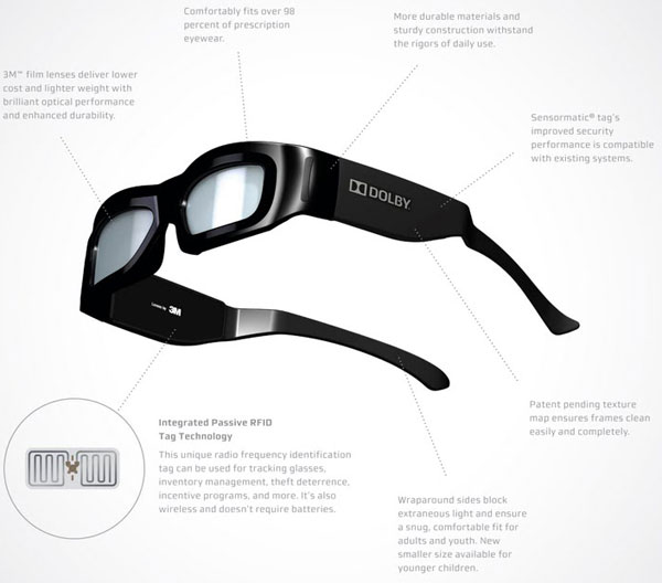 - 除了現有的杜比3D眼鏡已經加入的防盜標籤之外,新一代杜比3D眼鏡也加入了RFID標籤,且每個標籤的序號皆不相同。