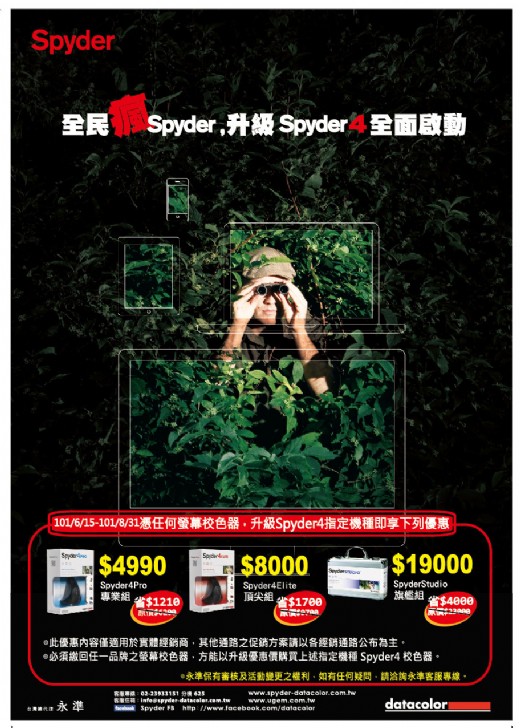慶祝Spyder4上市成功,並回饋現有顧客,Spyder 特別規劃了誠意滿滿的「全民瘋Spyder,升級Spyder4全面啟動」活動。凡於101/6/15-101/8/31憑任何螢幕校色器(包含Datacolor Spyder系列及市面上其他品牌校色器),購買 Spyder 產品指定品項,即可享有優惠價格。