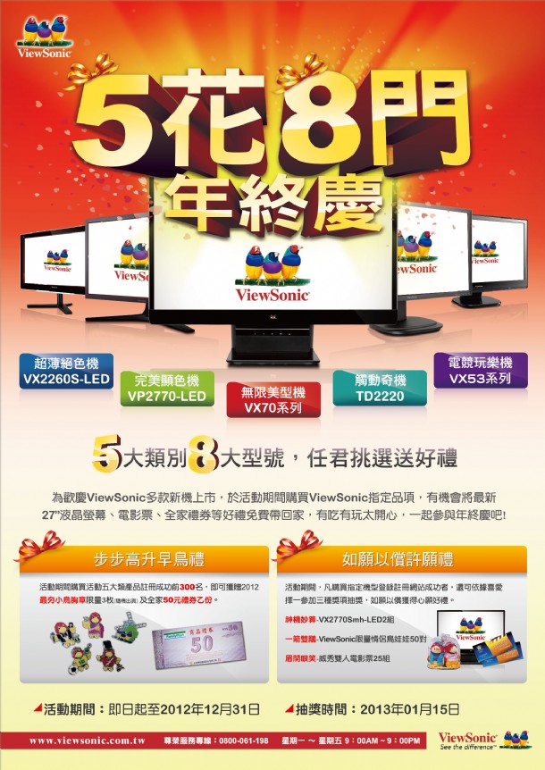 ViewSonic 歡慶年終慶,特別推出多款限量好禮, 即日起到十二月底, 只要選購ViewSonic活動指定機種: 超薄絶色機 (VX2260S-LED)、無限美型機 (VX2370Smh-LED、VX2770Smh-LED)、電競玩樂機 (VX2253mh-LED、VX2453mh-LED、VX2753mh-LED) 、觸動奇機(TD2220) 及完美顯色機 (VP2770-LED) 五大類別八大型號的機種, 於註冊網站登錄成功者, 即可參加「如願以償許願禮」 三種獎項抽獎活動: VX2770Smh-LED、ViewSonic 限量情侶鳥娃娃、威秀雙人電影票任您選! 線上註冊成功前300名, ViewSonic 再加碼贈予ViewSonic 最夯的小鳥胸章限量版3枚, 以及全家便利商店禮券! 年終慶吃喝玩樂盡在ViewSonic !