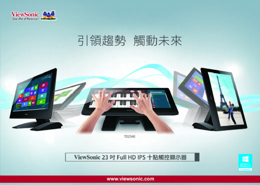 ViewSonic引領趨勢推出全台首創符合人體工學雙軸式基座的觸控顯示器TD2340,再次定義觸控顯示器新標準、新體驗。ViewSonic TD2340 IPS觸控顯示器採用最新電容式觸控技術,可輕鬆以指尖捲動螢幕、切換視窗、點選工作項目, 自然輕鬆享受流暢觸控之樂趣, 直覺式的操作更適合互動遊戲。 TD2340 IPS觸控顯示器還能進行多工螢幕處理,不僅工作效率倍增, 更可同時間進行多項娛樂活動,如瀏覽照片、欣賞影片、查詢資料等,省時多工更便利。TD2340 IPS觸控顯示器同時支援WindowsR 8作業系統, Win 8 的動態磚隨時呈現最新資訊、市集應用程式立即開啟即可瀏覽並下載、數百萬道串流歌曲、專屬個人喜好設定,玩樂工作盡情享受。
