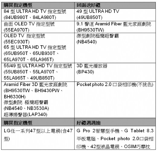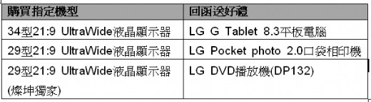 LG並同時推出液晶顯示器的「雙效護眼 好視降臨」活動,於5月28日至7月20日期間購買LG 21:9 UltraWide液晶顯示器指定機型,回函就可獲得G Tablet 8.3平板電腦或Pocket Photo 2.0口袋相印機等驚喜好禮。