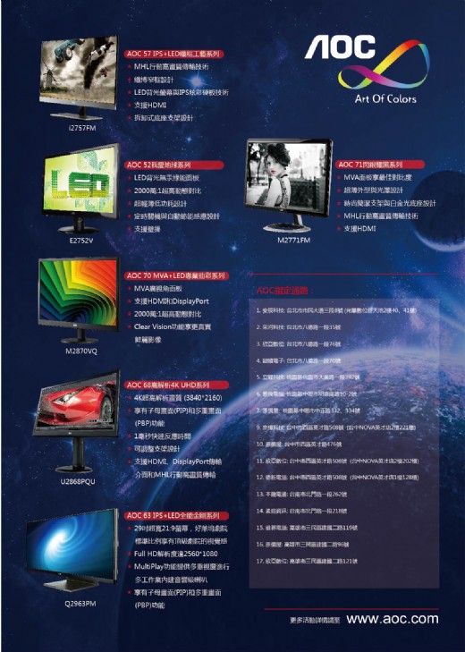 AOC震撼推出新款 4K顯示器U2868PQU,採用TN面板提供超高解析影像品質,擁有3840x2160超細緻解析度,搭載10-bit色深的RGB顯示面板,擁有1ms灰階反應時間以及1,000:1的對比度,呈現至臻色彩的鮮活體驗。內建兩組3w喇叭以及4埠USB集線器(USB 3.0 x 2 + USB 2.0 x 2),底座部份可上下升降、左右旋轉、前後傾斜、垂直旋轉等全方位、多方向調節,讓用戶保持健康舒適的坐姿。此外,AOC U2868PQU顯示器可結合子母畫面與多重畫面功能,並可與HDMI連接藍光播放器來觀賞影片,讓家裡客廳變影音劇院,書房變遊戲戰場,同時透過螢幕右方的DisplayPort、DVI、D-Sub來連接數位影音訊號和各種裝置的標準介面,一個顯示器就可以滿足各種不同的需求,提供更高品質及穩定的視覺效果。想要體驗AOC螢幕全猩饗宴,最佳時機就是現在!一系列的活動,讓您暑假玩個夠!