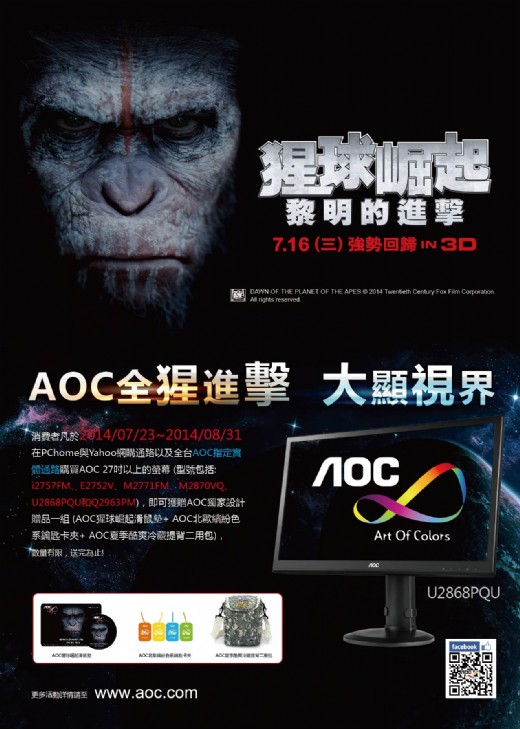 液晶螢幕品牌AOC於2014年暑假與美商福斯鉅片【猩球崛起: 黎明的進擊】合作,舉辦專屬猩星夜VIP活動,民眾只要於7月22日前購買AOC 27吋以上指定螢幕,並於活動網頁登錄指定產品序號1個,即可獲贈【猩球崛起: 黎明的進擊】VIP之夜免費電影票2張。除此之外,連續四個週末於:台北光華商圈、台中NOVA英才館,高雄欣亞數位建國館、曜越Tt eSPORTS電競專賣店台北西門店及高雄大統店,舉辦「探索猩螢幕、尋找猩正妹、發現猩活動」等主題之趣味活動!歡迎大家前往活動現場一起體驗遊戲競賽、打卡拍照並上傳照片,即有機會獲得多項超值限量好禮!AOC邀請您來活動現場一起同樂HIGH翻一夏!欲知活動詳請,請上AOC官方網站www.aoc.com。