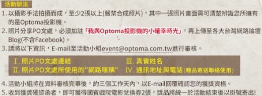Optoma 為了回饋愛用者的支持,即日起至11月20日止Optoma舉辦了線上「投影幸福樂分享」活動,只要是有購買Optoma投影機的用戶,不論機型、新舊,都可以參加。重點是要把幸福甜蜜與令人開心的畫面,透過Optoma投影機投放出來,以及與投影機的創意合照,發佈並上傳至國內各大網路論壇或部落格,就能免費獲得電影票 2 張。分享條件,自行拍攝照片至少2張,並將發布連結電郵至活動小組信箱。