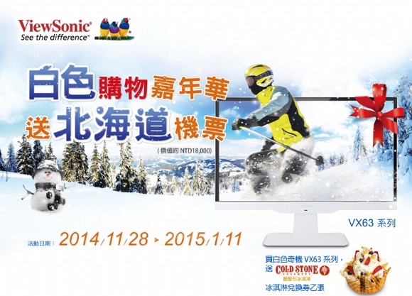 一年一度總是給人一片白色美麗印象的聖誕節即將到來囉!不論在逛街時或是看到各商家佈置,也越來越能感受到濃厚的佳節歡樂氣氛。全球視訊領導品牌 ViewSonic 希望一起來分享白色聖誕節歡樂氣氛,推出白色購物嘉年華促銷活動,即日起至 2015 年 1 月 11 日止,只要購買 ViewSonic 任一 22 吋(含)以上之液晶顯示器,上網登錄成功後即可參加抽獎,將獲得北海道單人來回機票一張(價值約 NT$18,000),盡情享受異國雪花片片的雪白聖誕節。另外購買 VX63 白色款式機種系列(22 吋 VX2263Smhl-W 和 23 吋 VX2363Smhl-W),上網登錄成功後,即可立即獲得 COLD STONE 酷聖石冰淇淋兌換券乙張(價值 NT$140)。除此之外,分享再加碼,於活動期間,將此活動促銷訊息分享於臉書上,將週週抽出 ViewSonic 限量情侶鳥娃娃 ! 想要為今年聖誕節妝點白色禮物的新舊會員們,趕緊把握這不可錯過的好時機!