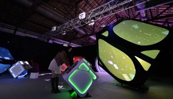 巨石魔法區在Optoma高階投影技術的力助之下,更可讓人們猶如置身於虛擬實境的環境中,進一步達到身歷其境感受的體驗。其中以18台短焦投影機EC320ST搭載影像拼接技術之導入,不僅讓像骰子般的巨石影像畫質細膩度大幅提高;亦克服了六面體內投射角度的問題。在此展區,體驗者可藉由巨石陣展台,透過互動利用影像式呼吸心跳、軟性壓力等感測方式建構出生命數值,創造出屬於自己的虛擬角色。