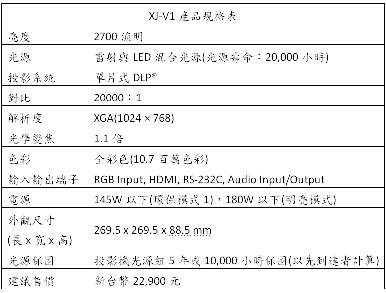 XJ-V1無燈泡投影機預計6/1正式上市,建議售價為新台幣22,900元,並享有投影機光源組5年或10,000小時保固(以先到達者計算),前100名購買者即贈送兼具溫溼度計的卡西歐大字幕鬧鐘。